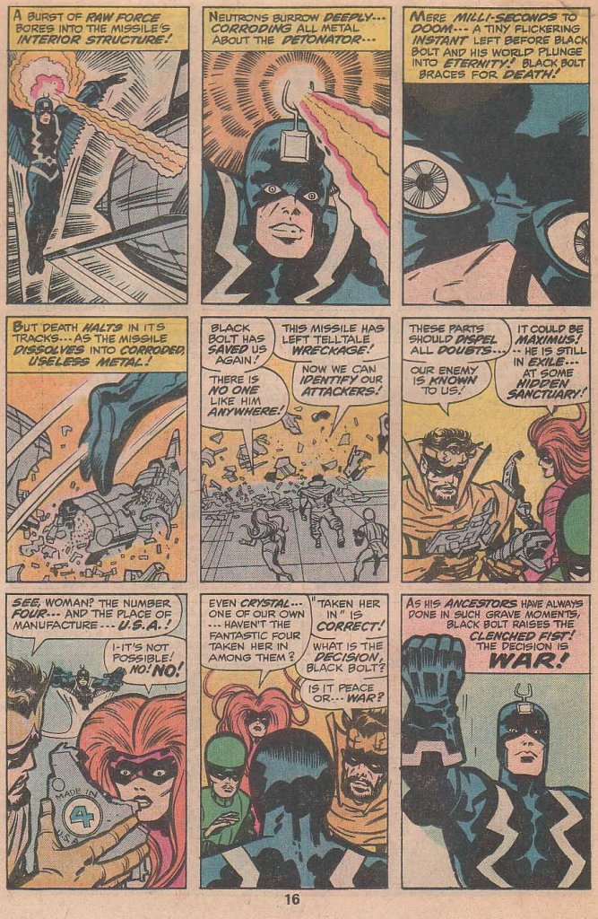 The story was relatively basic, albeit entertaining. The first half of the issue (the first strip in the original printing) introduced the Inhumans and the key players of the Royal Family. Also introduced are Maximus and his band of Evil Inhumans, who have been exiled following their latest coup attempt. But Maximus has a new scheme in mind, and he arranges for a pair of missiles to be fired off at the Inhumans’ hidden land of Attilan–missiles adorned with the log of the Fantastic Four. The Royal Family, in particular the King himself, Black Bolt, are able to stop the missiles and prevent any damage to the city–but they’re perturbed by the idea that their friends in the FF have betrayed their location and attacked them. Black Bolt raises his fist to signal: war!