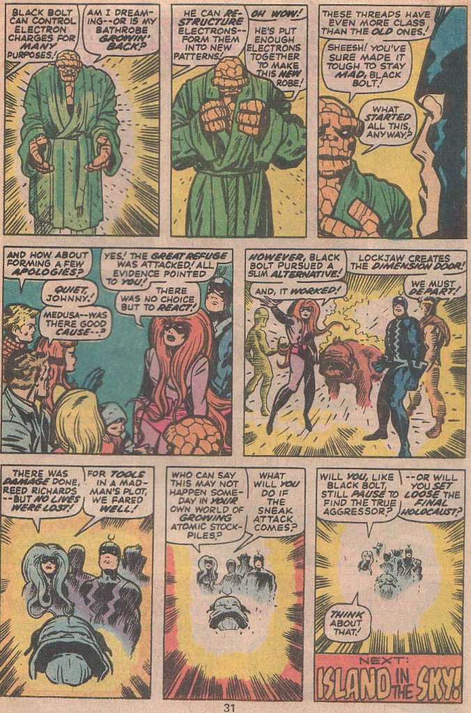 Back at the Baxter Building, the reunited Fantastic Four are about to launch a counter-offensive when the Inhumans suddenly sue for peace. Black Bolt has received word from Triton that the true villain has been captured, and so the Inhumans withdraw. But not before Medusa shakes her finger at the FF, and all humanity in general, saying how, even in the midst of an aggressive attack, Black Bolt sought out an avenue of peace, unlike the human race would. Which is some pretty world-class gaslighting, given that the Fantastic Four were just minding their own business, having done nothing wrong, when their supposed friends broke into their home, trashed the place and roughed them up. And the Inhumans are somehow the victims here? Even as a kid, I don’t think so.