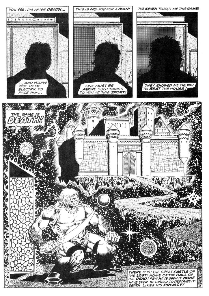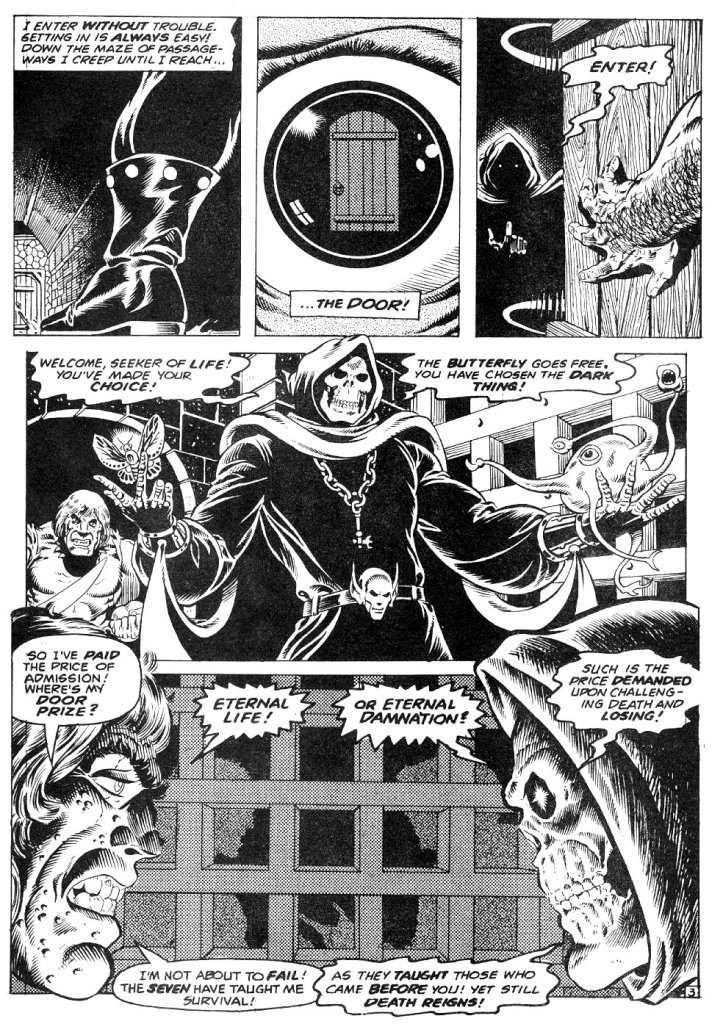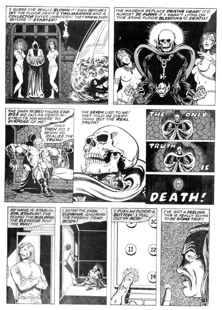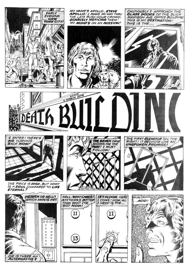 “Death Building” was a typical psychedelic Starlin story, influenced as much of his output was in these years by the work of Michael Moorcock. But it also has a semi-autobiographical aspect to it. Not only does Starlin name his main character, Steve Apollo, after a pseudonym that he would occasionally use when a particular bit of work had been tampered with past his liking, he also himself makes a cameo appearance at the end of the story under his own name. The “Death Building” in question was the building that in real life headquartered Marvel Comics in those days, so there was a secondary aspect to the entire tale, one that presaged Starlin’s later “1000 Clowns” story in WARLOCK or “Dynamo City” in SILVER SURFER.