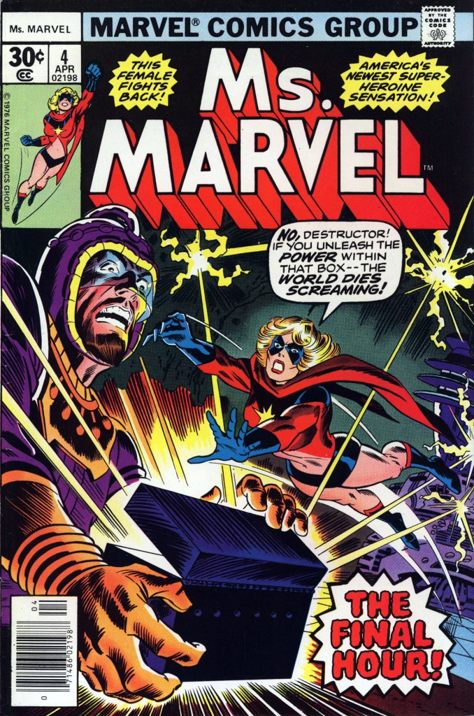 MS MARVEL was another title that I sampled out of the Big Bin of Somewhat Older Comic Books at my local drug store, and for the same reason: the need to hit a total of 5 purchases so as to be able to get them for a dollar, as opposed to risking the whims of the cashier of the day, as happened to me once or twice. I’m not sure exactly why MS MARVEL made the cut, apart from the fact that it was clearly a super hero title rather than a monster or western or war book–honestly, that may have been all there was to it.