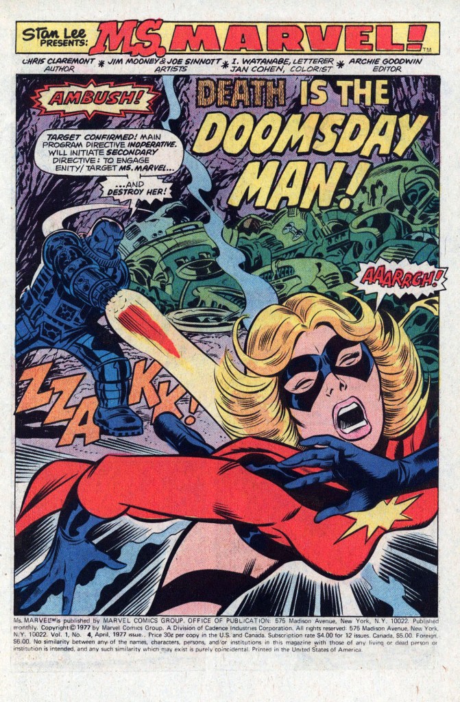 In this particular issue, the first one that Claremont got to plot himself (he scripted #3 over Conway’s plot) Ms Marvel is in combat with the Doomsday Man, a robotic superweapon developed by the military as a final resort in the face of overwhelming attack. It had once battled the Silver Surfer and seemed to be destroyed, but now A.I.M. has rebuilt it. Ms Marvel, meanwhile, has followed the clues as to her identity and origin back to the Mangitron, and eliminated the mental block that had been keeping her costumed identity walled off from her civilian one. There’s also another player, scientist Kerwin Korman, running around in the super-villain guise of the Destructor, also seeking the power source buried in this old Kree weapons depot. But the immediate problem for Ms M is that the Doomsday Man has shifted its attention to her, and is set on obliterating her.
