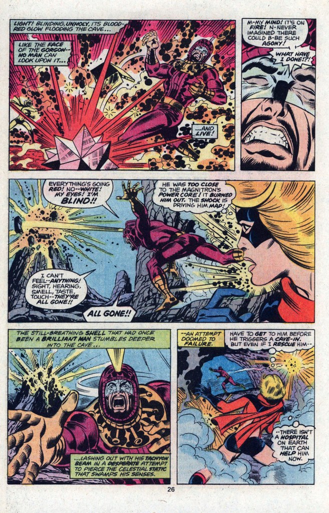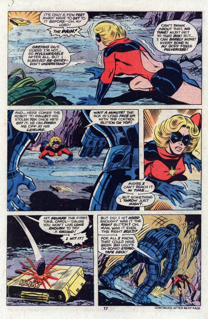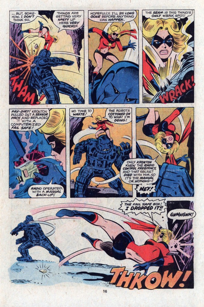 That means that most of this issue is–you guessed it–an extended fight sequence, with Ms Marvel holding her own against the far more powerful Doomsday Man. It’s a pretty good action sequence, though–and the real attraction is the manner in which Claremont immediately begins to refine Carol’s voice. The Marvel books of this period weren’t shy about featuring a running play-by-play in the form of thought balloons, and here Claremont uses them to great effect in giving Carol a bit more of an individual personality. He’d only get better at this as time went on. Anyway, Carol is able to pull the Doomsday Man’s failsafe unit out of its head after cracking it open, then activate the thing with a thrown rock. Fight over–but the Destructor is still lurking in the shadows, and Ms Marvel is on her last legs.