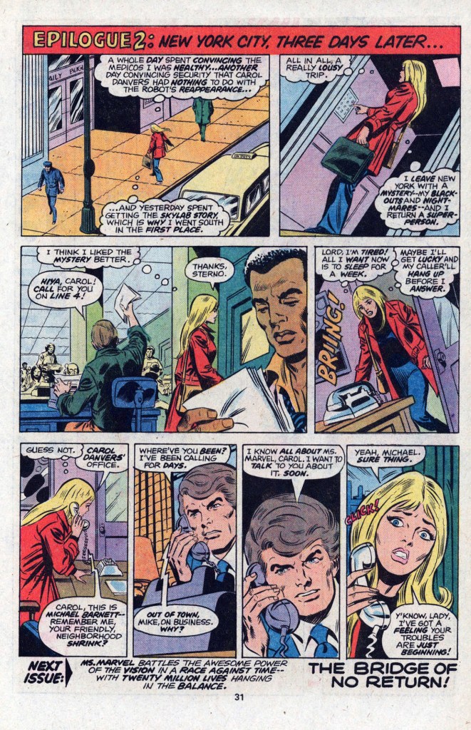 The Destructor, though, isn’t all that interested in Ms Marvel. He’s come here seeking weapons, and he thinks he’s hit the jackpot when he locates the power source for the Psyche-Magnitron. Unfortunately for him, he opens the thing up, and the energies inside burn out his brain, frying his five senses and driving him mad. I get the sense that Conway may have been setting the Destructor up to be a recurring foe for Ms Marvel, but it appears that Claremont wasn’t interested in going in that direction. But that’s the ballgame, save for some end-of-issue subplot set-up. Conway had put Carol to work within J. Jonah Jameson’s publishing empire, which gave him a ready made cast of familiar Spider-Man characters to draw upon. Again, well-intentioned, but this was another bit of hand-me-down activity towards the character. If MS MARVEL was to succeed (and, ultimately, it didn’t), Carol was going to need to find her own life and her own cast. Claremont would get to work on that over the following couple of issues.