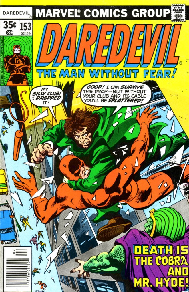 Anyway, Daredevil gets to Heather’s apartment, to find his old sparring partners the Cobra and Mister Hyde waiting for him–a good way to launch directly into a fight sequence without much need for set-up. Daredevil isn’t sure what the criminal duo is doing there, nor what has become of Heather, but right now the more immediate problem is saving his own life. Things get dire as the fight crescendos when Hyde launches himself and Daredevil out the window. The sightless crusader is able to break his fall on a handy flagpole, but he wrenches his arm while doing so. And Hyde survives the fall, but is taken out of the battle by it.