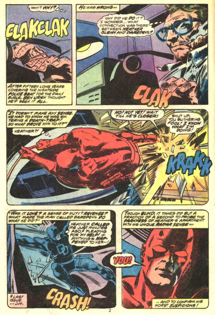Interestingly, Colan’s initial depiction of Urich is a bit heftier and shabbier than he would eventually become. He’s working on the story of Daredevil’s battle with the Cobra and Mister Hyde, a battle that he was drawn into after receiving a call from Matt Murdock’s girlfriend Heather Glenn. Her father had committed suicide while incarcerated, the victim of the mind-controlling Purple Man whom Daredevil had been chasing after for literally months. This would be the first step in the running plotline that would see Urich unravelling the secret of Matt’s dual identity as Daredevil and ultimately deciding to burn the story rather than publish it. It’s a sequence that’s often associated with Miller (who drew most of it), but it really originated with McKenzie.
