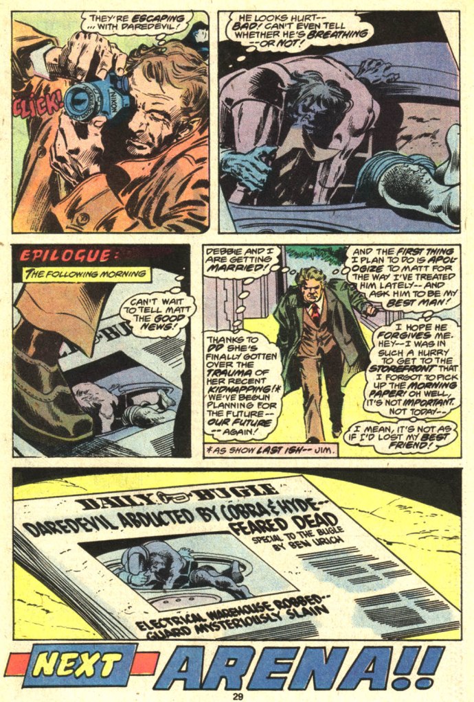 Ben Urich is on the scene, and able to snap a phot of the villains escaping–a photo that accompanies his front page article on Daredevil’s abduction the next morning. The final three panels of the issue reintroduce us to Matt’s partner Foggy Nelson (though Foggy is never named–a bit of the bad craft prevalent in the Marvel titles that Shooter was determined to stamp out over time) and a bunch of subplot stuff is hustled onto the page, as though it had been meant to be in the issue earlier and it simply didn’t get drawn because Colan got carried away with the action. I don’t know if that’s the case, but Colan certainly did have the reputation of both not reading ahead in the plots he was illustrating and also running into pacing difficulties, where he’d suddenly need to cram a bunch of story into relatively little space because he’d used too much real estate at the start. In any event, things were once again To Be Continued. I have to say, from my point of view, Daredevil had been chasing after the Purple Man since I had begun reading the series several issues ago, and I still had yet to even lay eyes on the elusive string-puller. Which made the whole story feel tenuous to me. Fortunately, the next issue would wrap this long-running saga up and bring it to as good a climax as was possible.