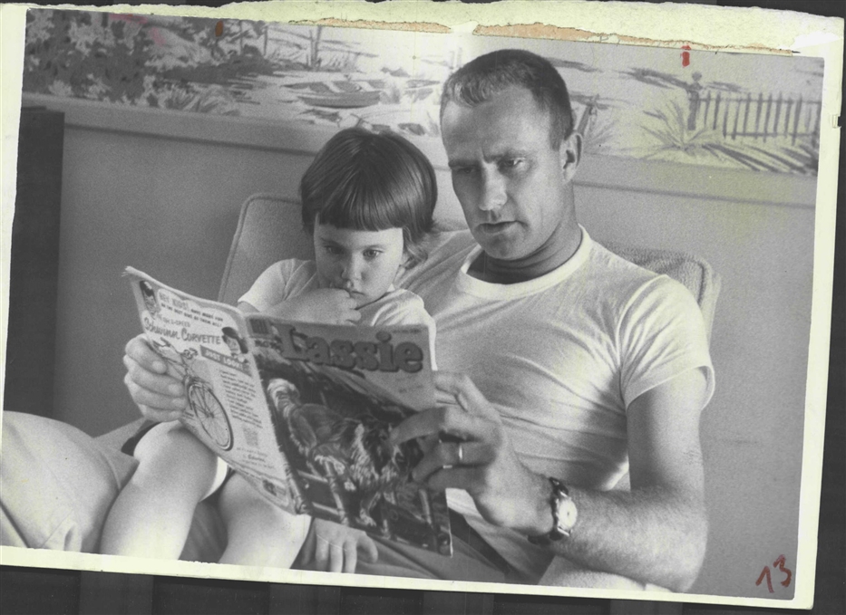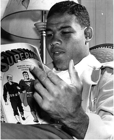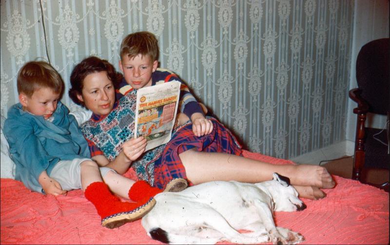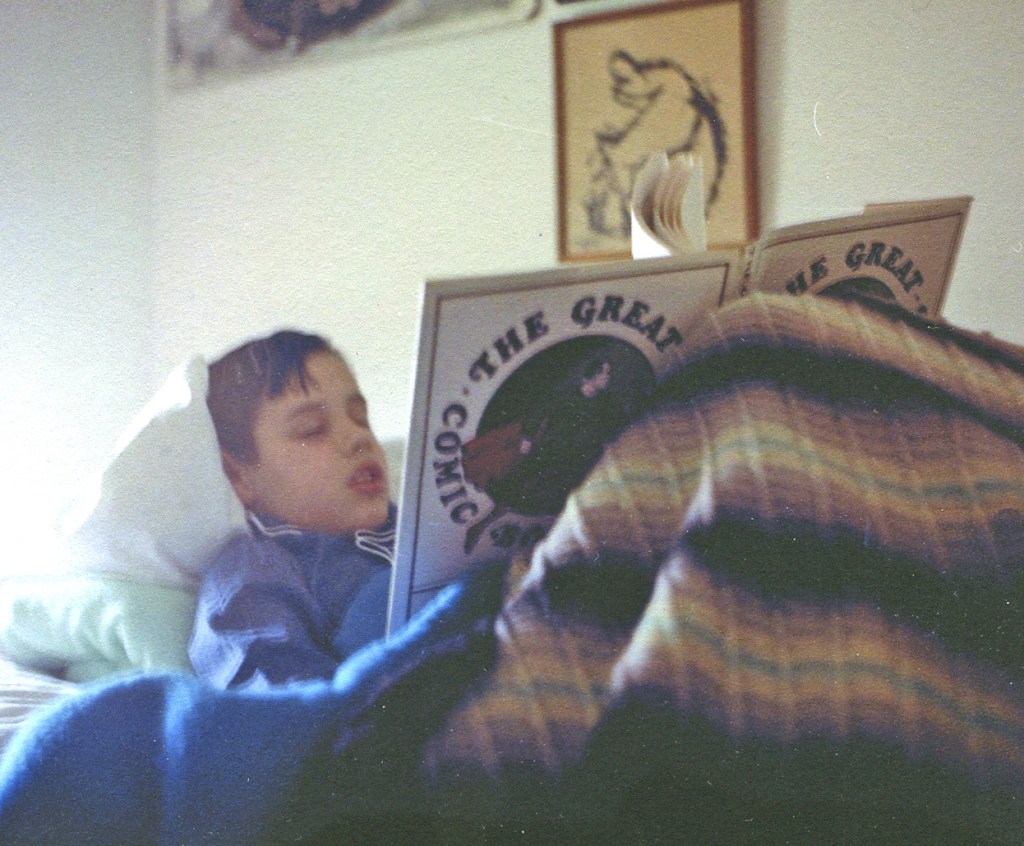 This vintage photo includes a boy reading MARVEL COMICS #1