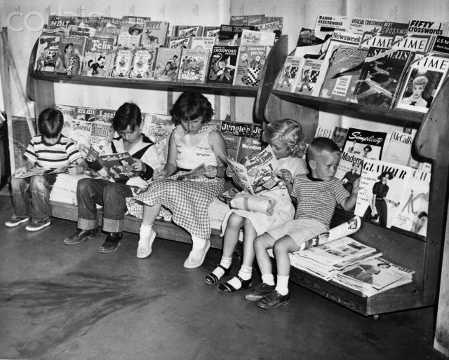 Another collection of vintage photographs showing the comic books of yesteryear either on sale or being consumed by readers of the era.