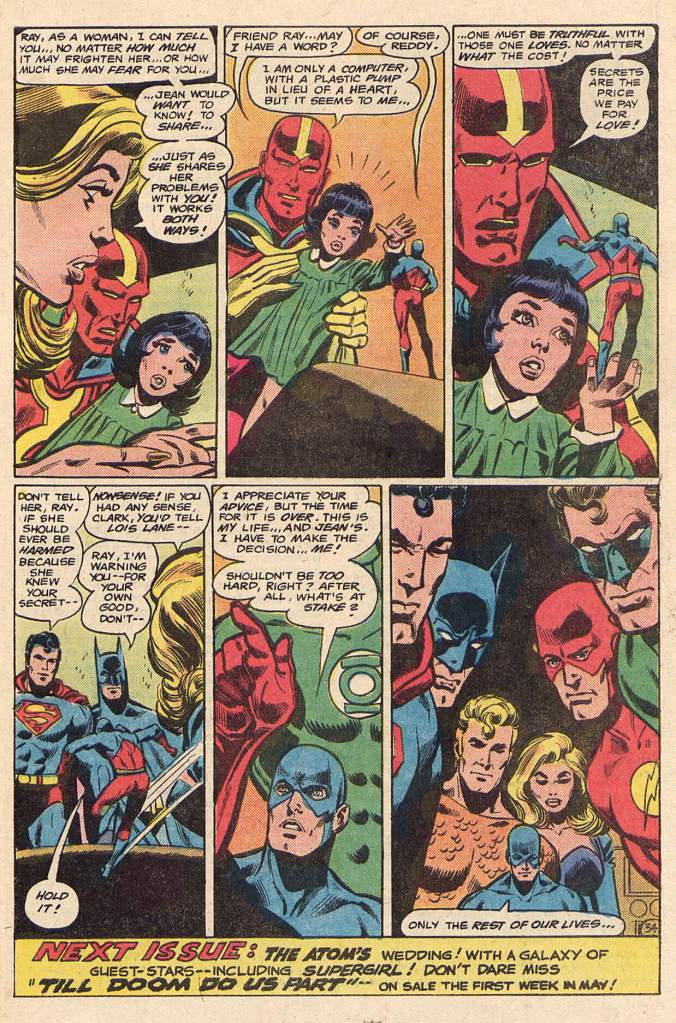 Finally, everybody gathers back at the satellite HQ (except fort the Phantom Stranger, who has of course departed when nobody was looking) to help the Atom decide whether he should reveal his costumed identity to his intended bride jean Loring. I don’t really see how there can be any question here, but super heroes tended to worry about this kind of thing for many, many years. And here, no decision is reached–largely because this is all a lead-in to next month’s wedding of the Atom. So, yeah, a bunch of things happened in this story, but nothing much happened–even looking at it again, not anything that is likely to stick to my ribs and be remembered once this piece is posted. The fiend with Five Faces was a pretty colorless antagonist, and the League themselves didn’t do a whole lot in terms of vanquishing the thing.