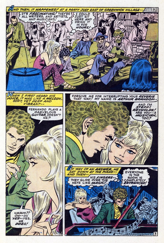 What Marvel did have going for it in this era was a stable of some of the finest artists in the field, who exceled at doing material beyond just super heroes. Probably the best all-around draftsman at Marvel at that time was John Buscema, and possibly the best romance artist was John Romita. Romita in particular had spent almost ten years doing romance books for DC before he was lured back over to Marvel by editor Lee.