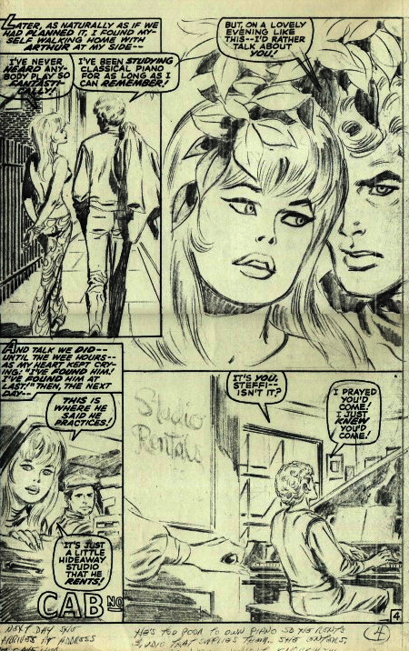 This particular romance story first saw print in MY LOVE #3 in late 1969, though it would be reprinted a few more times hereafter. And fortunately for historians, copies of the first few pages of pencils by John Buscema have survived. As time wore on, Buscema got looser and looser with his pencils, focusing on the storytelling and leaving the final finish to others. It was a way of maximizing his prodigious storytelling skills. But here, he’s still doing full tight pencils, and they’re pretty amazing to look at, a testament to his drawing skill. Romita does his usual expert job of embellishing them in the final story, but there really isn’t anything much he can add here–Buscema’s pages are immaculate.