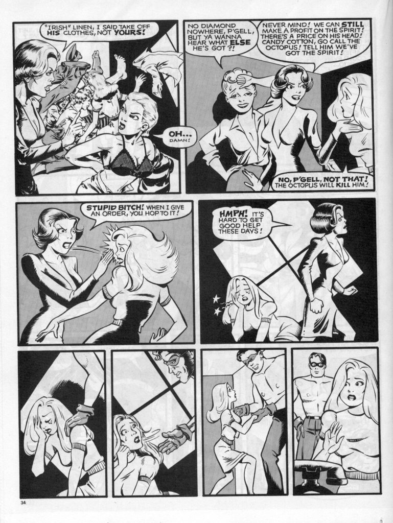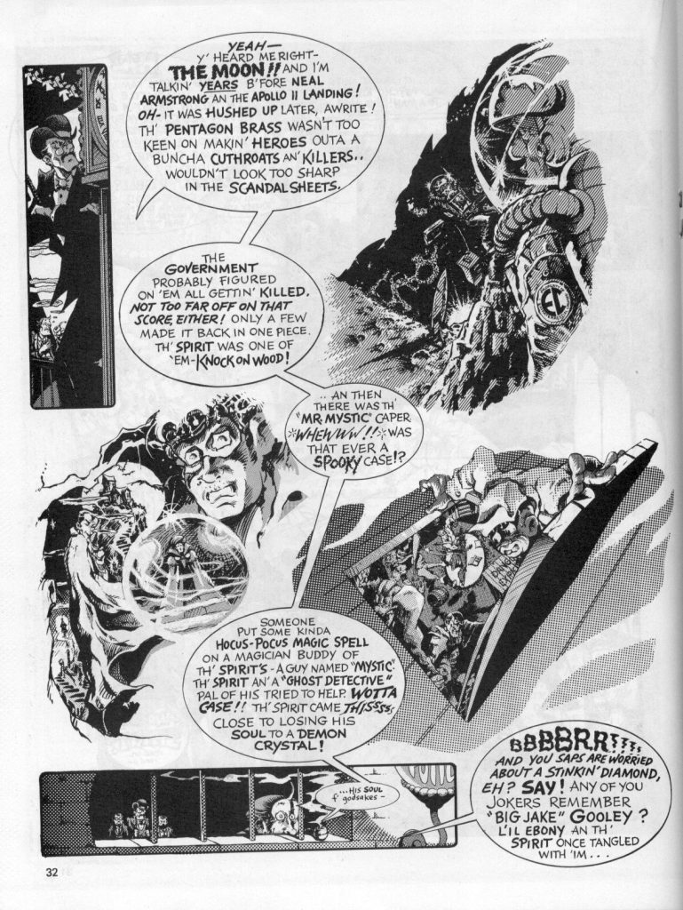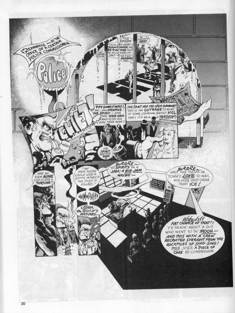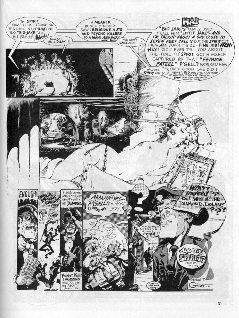 The result of Eisner’s largesse was that publisher Denis Kitchen and associate editor Cat Yronwode gathered together a broad assortment of creators and put them to wok on an all-new Spirit story, produced Jam style. Each creator was encouraged to bring his or her own style and interests to the fore in their section, and while there was a loose overall plot to follow, the creators were also encouraged to take things in wild and interesting directions. The result, the “Spirit Jam” story, was an amazing collaboration by some of the greatest practitioners of the art form who were working in those days. Eisner himself contributed three pages to the effort, this opening page, the page beginning the story in earnest, and the final page which tied everything together.