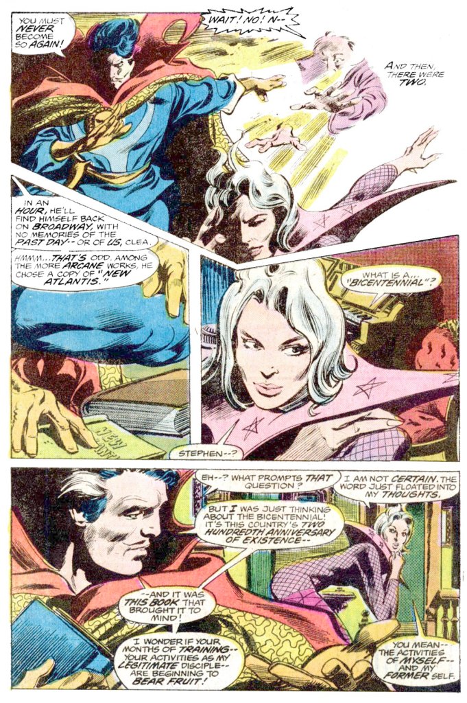 The story opens on a bit of a dogleg, cleaning up a dangling subplot from prior issues. Strange is in pursuit of James Mandarin, who had petitioned to become Strange’s disciple and was rejected. In the absence of the Master of the Mystic Arts, mandarin was able to purloin some mystic texts from Strange’s library, and the Sorcerer Supreme wants them back. Strange and Clea corner the fleeing Mandarin on the streets of New Jersey, and zap him back instantly to the Sanctum Sanctorum, where the Doctor can reclaim his property. Strange off-handedly mind-wipes Mandarin and casts him away–but he’s disquieted by the fact that Clea asks him about the Bicentennial while he’s paging through one of the stolen books, relating to New Atlantis.