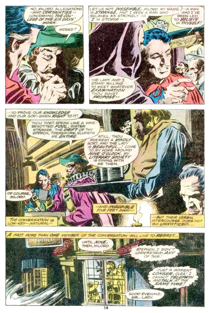 Strange and Clea have dinner with Sir Francis Bacon, and exposit further on the importance of the unpublished portions of New Atlantis. sir Francis is more than happy to allow Dr. Strange to read it, and he is fascinated by its contents. However, that evening, he and Clea are set upon once again by Stygyro, this time in person along with his minions. While Dr. Strange is the Sorcerer Supreme of the 20th Century, Stygyro is th3e Sorcerer Supreme of the 17th, and so the two are evenly matched. So despite Strange and Clea’s best efforts, they are unable to prevent Stygyro from making off with half of the manuscript, the unpublished portion.