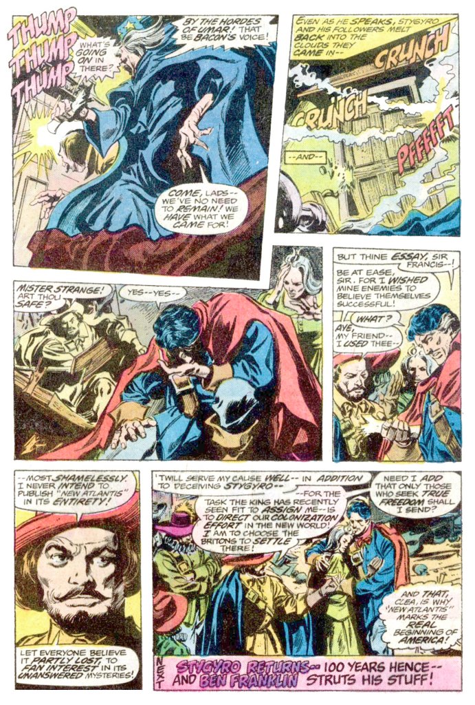 There’s a legend connecting the two that Strange heard when he was but a student of the mystic arts himself, so he uses this momentary bit of clairvoyance as a rationale for himself and Clea to do a bit of mystical time traveling. They arrive not in 1776 as you might expect, but rather in 1618 London, where they seek out Sir Francis Bacon, the author of New Atlantis. Only the first half of the manuscript was ever published, the back half, describing Bacon’s ideals for a new Utopian society, was believed lost. But Strange, of course, has read a copy. Along the way, he and Clea are attacked by brigands in the service of the sorcerer Stygyro, who sense the magical power of the pair. This serves to get a small bit of Marvel action into an otherwise talky issue.