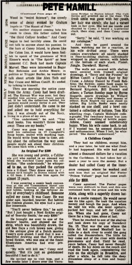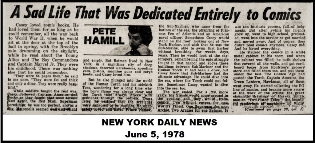 I first read this Pete Hamill column when it was first published in the New York Daily News on June 5, 1978. In those days, I read and collected any mainstream articles about comic books that I came across, keeping them all in a three-ring binder, scrapbook-style. This piece in particular always stuck with me though, a far cry from the typical sorts of “ZAP! POW! OLD COMICS ARE WORTH MONEY!” pieces that one would usually come across. That binder full of clippings sadly disappeared over the years, and it had been literally decades since I had read this piece, though I remembered the basics of its contents well. But recently, Dr. Michael J. Vassallo, who has been collecting old newspaper comic strip sections, posted the thing in one of the Facebook groups he was a part of. And so I reproduce it here for your own enjoyment.