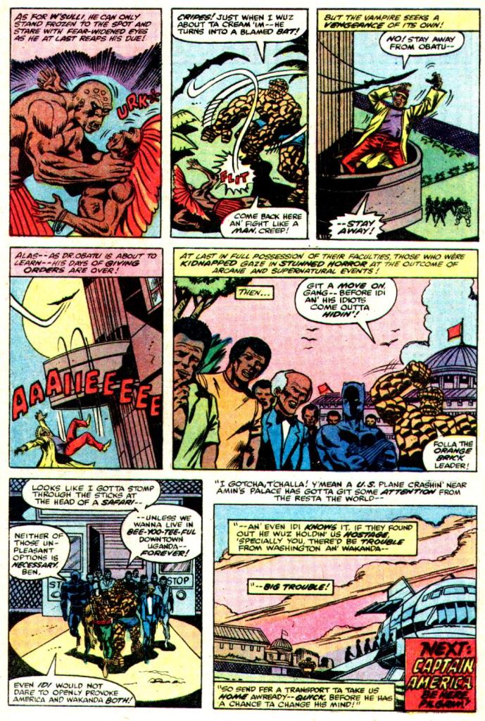 Seeing the Thing start to walk away from the explosion of his plane and towards their position causes Idi Amin to run for his life. He leaves it up to Obatu and W’Sulli and their zuvembie creature as well as his own soldiers to combat the enraged powerhouse. Good luck with that! Having no physical power that can halt the Thing’s rampage, Obatu attempts to appeal to his humanity by threatening the life of T’Challa if he does not relent. But Brother Voodoo has divined where and how the spirits of the captured people are being trapped and ensorcelled, and he directs the Thing to shatter the container, bringing everyone but particularly the Black Panther back to his senses.