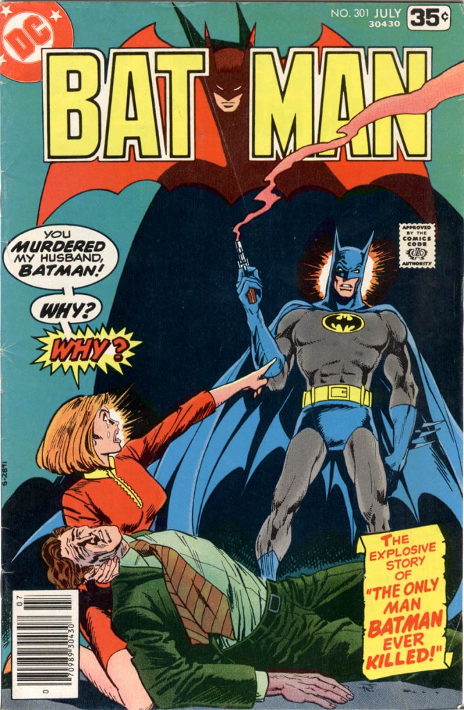 It’s at this moment that Batman comes crashing into the place. But his startling arrival has an unexpected result., The cornered Brant starts blasting at him randomly–and while the Batman is able to relatively effortlessly take down the mob chieftain, one of the stray shots kills Milbrook. This is the second person in 16 pages to get cut down by a stray round in a Batman fight–not exactly a crowning achievement in safe and secure crime-fighting. Realizing that the wire-heads will now have been set off, starting a wave of bloodshed across the city, Batman does the only thing he can think of: when the dead man’s wife shows up, the Caped Crusader himself takes credit for the murder–reasoning that the wire-heads will thereafter only target him. And that’s where this story is To Be Continued! But Vern did manage to get the cover scene in right before the closing bell.