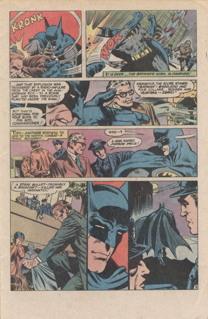 The story hook here is also typically provocative: there’s somebody that Batman has killed with a gun, a violation of one of the central premises of the character. How can this be? You were meant to plunk down your 35 cents in order to find out. Even the splash page pushes against this conceit heavily. And the answer is relatively mundane, and actually dispensed with by page 5 of the story: Batman intervenes as a gang of criminals attempt to rob the proceeds from a major Gotham charity auction, and a bystander is struck and killed by a bullet fired by one of the gunmen whose aim was loused up by Batman’s punch. So there was a death and there was a gun and batman was involved–but it was nothing as provocative or life-changing as the cover and splash page would lead you to believe. But by this point, DC had your three dimes and a nickel–so you might as well continue reading and see if anything interesting happened beyond this.