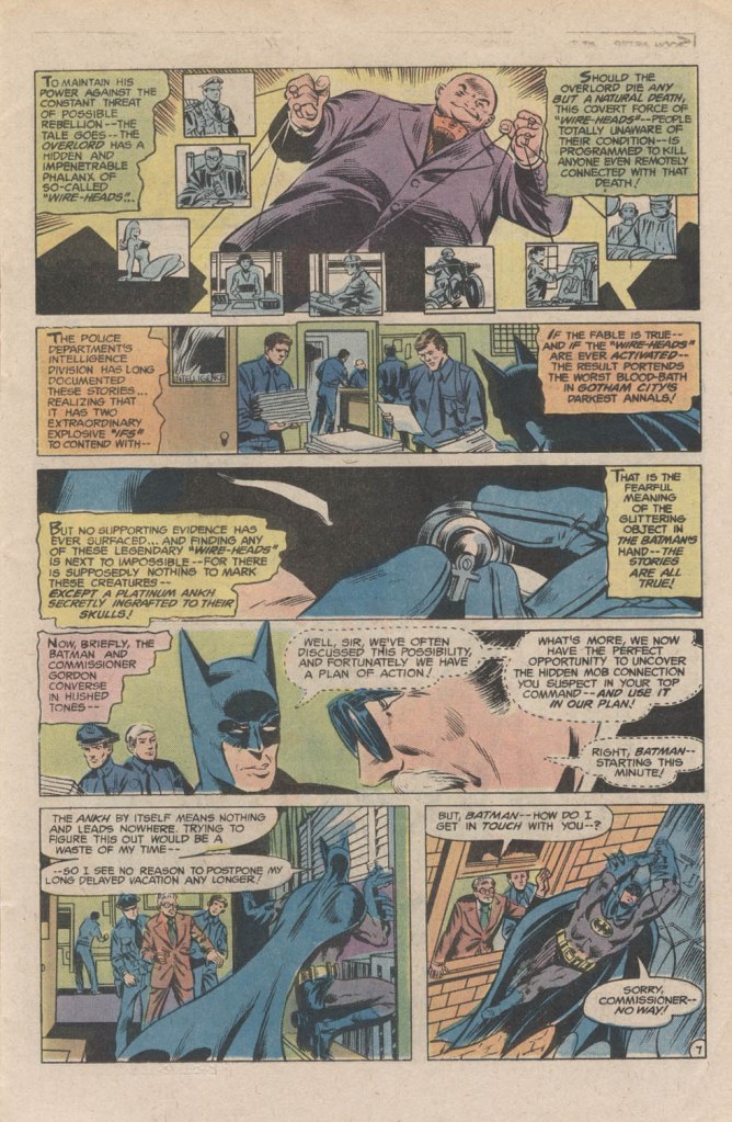 And it turns out, there is! A twist as absurd and implausible as anything Bob Haney ever put to paper. When the dead man is autopsied, a tiny platinum ankh is discovered in his skull. Batman and Commissioner Gordon realize that this marks the man as an operative of a mysterious Overlord of Crime who has plagued Gotham for years. According to rumor, the Overlord has a phalanx of close operatives each of whom was implanted with such an ankh, and who were given a post-hypnotic command to kill any and all people related to the Overlord’s death should he be killed in any unnatural fashion. The fear of unleashing this bloodbath on the city is what’s held the Masked Manhunter and Gordon in check up till now–especially because Gordon suspects that the Overlord is positioned high up in the police command. But this accidental happenstance gives them an angle through which they can investigate.