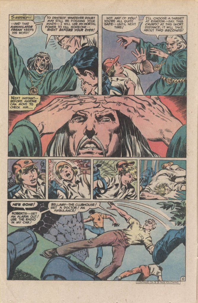 Shortly thereafter, a strange figure in mystic robes bursts into police headquarters. He introduces himself as Akeldama, and claims that he’s mastered the psychic ability of being able to cause anyone within a five mile radius to drop dead of a heart attack. To prove his power, he demonstrates on a random person buying nuts a short way away. True to Akeldama’s word, the man drops dead–and the mystic has vanished before Gordon and his crew can interrogate him. The Batman has gone away on vacation and cannot be contacted, so Gordon and his cops are on their own. After a futile search of several days, Akeldama reappears once more on a golf course where Gordon is playing a few holes. As another demonstration of his power, the mystic causes one of the caddies to keel over, then once more eludes his pursuers. Gordon is perplexed and stymied.
