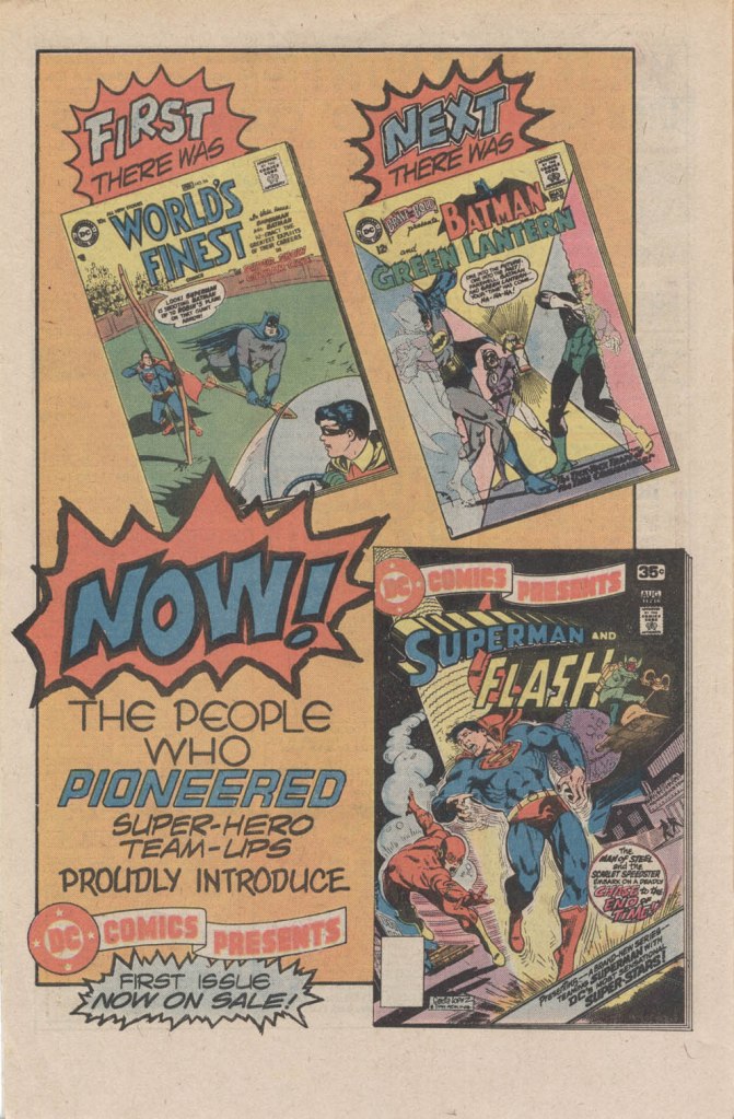 This issue also included a few different ads and miscellaneous features that I got to see for the first time. Publisher Jenette Kahn’s column in this issue announced that the DC heroes were going to be appearing in newspapers coast to coast in the World’s Greatest Super Heroes daily strip, which sounded exciting. New York was one of the areas that got the strip, and I followed it avidly, especially at first. There was also this ad for the first issue of DC COMICS PRESENTS, which was a home run ad for me–though it would turn out to be a bitter one, as DC COMICS PRESENTS never shipped to my regular 7-11, and so I didn’t get to read the story of this new contest between Superman and my favorite the Flash for quite some time. But almost as interesting to me was the two older covers that were shown, for both WORLD’S FINEST COMICS and BRAVE AND THE BOLD. These glimpses into a publishing history that I was desperate to find out more about were like catnip to my sensibilities.