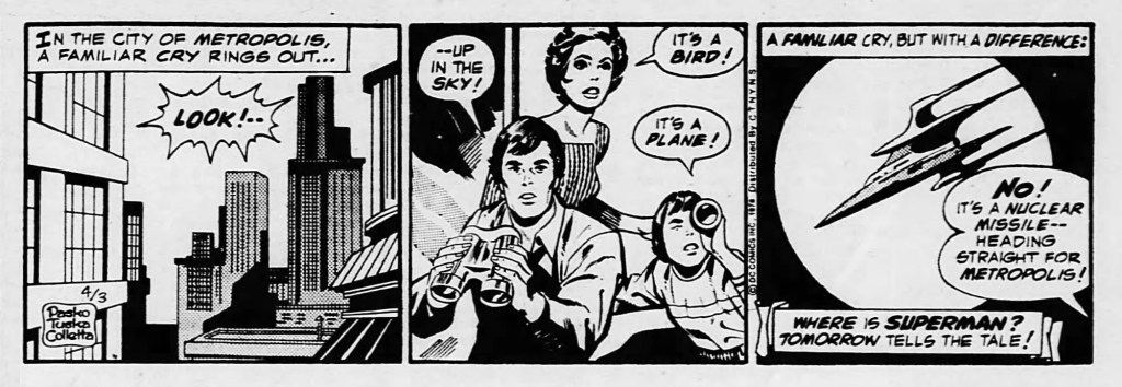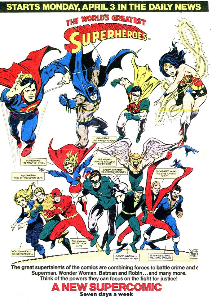 The first was the launch of DC’s new Newspaper comic strip, WORLD’S GREATEST SUPERHEROES. The ad above had run on the Sunday Daily News comics section at the beginning of the week, and the strip itself rolled out that Monday, April 3rd. I was super-excited about the prospect of getting a new fix of my favorite DC heroes every day (my household took in both the Daily News and Newsday on a daily basis, so I had access to all sorts of strips.) especially since the characters pictured weren’t simply the most well-known Super Friends, but also deeper cuts such as The Flash (always a selling point), Green Lantern, Black Canary, the Elongated Man and Black Lightning.