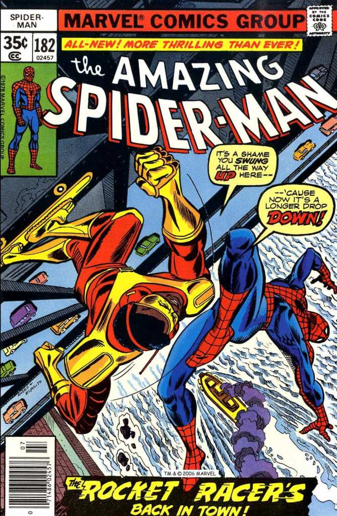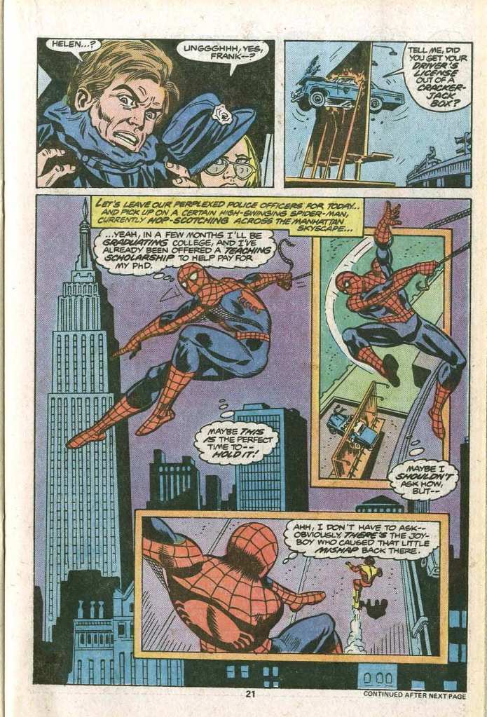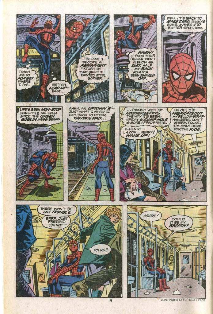 This issue brought back the Rocket Racer, a bit of a throwaway character that previous writer Len Wein had used in the opening half of an issue ten months earlier. New author Marv clearly thought there might be something to do with him. I will say that it was uncommon to see a black super-villain in these days. Frankly, the number of faces of color to be found in all of comics was relatively few. But that definitely helped to separate out the Racer from the rest of Spidey’s nefarious enemies. The Racer’s shtick was that he had a rocket-propelled skateboard that could cruise right up and down the sides of buildings–the ultimate freestyle skater, in an era before that terminology caught on. The issue opens with Spidey finding the Racer in the middle of a caper, ripping off a suitcase full of evidence of embezzlement on the part of businessman Jackson Weele. Spidey gets involved, but the Rocket Racer leaves him in the dust, and the wall-crawler is forced to take the subway home to his apartment. The goofy gag above is typical of the Spider-Man books of this era, one of the things that made them so memorable and made Spidey feel like a hard-luck ordinary Joe. Nobody uses this much real estate for a comedy bit like this anymore.