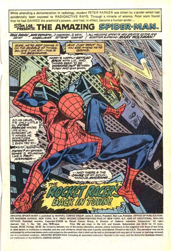 funny that the cover proclaims “All-New!” On your post about all of the “Dreaded Deadline Doom” reprint issues, I pointed out that many times the cover of the NEXT issue would proclaim “all-new!” I guess in this case it’s because the previous issue, SPIDEY 181, was an “Album” issue.