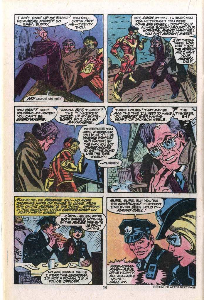 While Peter Parker checked in with his civilian life, checking in with his extended cast of characters (and being sought out by a mysterious woman in a beret–who could she be? ) the Racer heads for Weele to get his payoff. But the Racer has had second thoughts–his equipment is pricey and he owes the Tinkerer big bucks for having set him up with his gear, so he holds back on some of the key evidence that could send Weele up the river, telling the distraught businessman that the terms of their arrangement have changed, and that another cash payment will be required. Weele fastens on the Racer’s mention of the Tinkerer, a thought that will lead him next month to becoming one of the most bizarre and ridiculous menaces in marvel history. But we’ll get to that in future days. Meanwhile, Marv takes a few panels for this super-sexist sequence setting up a pair of cops who’ll be involved in a chase sequence with the Racer over the next couple of pages. It’s a bit that hasn’t aged well (and likely was a bit ill-considered even at the time it was written.)