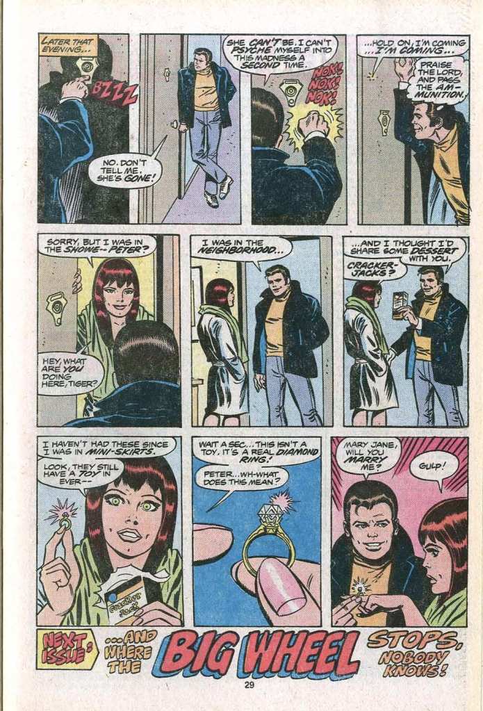 The final page of the story has Peter turning up on the doorstep of his longtime romantic interest Mary Jane Watson. MJ was still depicted as a bit of a flighty party girl at this point, so it’s genuinely a bit surprising when Peter proposes marriage to her here. I can remember this feeling like a big deal: the question of what she would say and whether the pair would be wed felt real to my 11 year old self in a way that it wouldn’t today. For the record, I was against it. MJ the party girl rubbed me the wrong way a lot of the time–I simply didn’t like her much, and so the idea that Peter would get stuck with stuck with her for all time seemed like a pretty lousy turn of events to me back then. Anyway, To Be Continued!