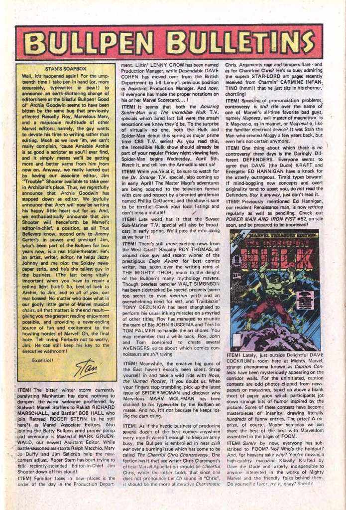 As I mentioned at the top, the Bullpen Bulletins page features Stan walking readers through the editorial changes that were happening. It also mentions both the INCREDIBLE HULK and AMAZING SPIDER-MAN television series that would be starting up, and that TV movies for Dr. Strange and the Sub-Mariner were on the way (only one of which would actually happen.) Of note, Mark Gruenwald’s hiring was mentioned. Mark would go on to be a critical piece of what Marvel would become over the next decade-and-a-half.