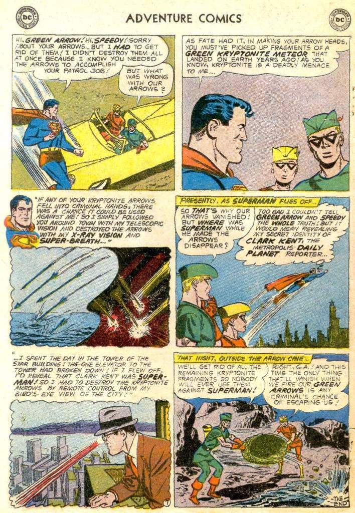 Yep, that’s right! Green Arrow had inadvertently carved his new arrowheads out of Kryptonite from a recently fallen meteorite, and Superman has ben dispatching them from afar all along so that they wouldn’t pose a threat to him. Why the Man of Steel didn’t help out with any of the crooks Green Arrow was attempting to capture while he was doing so remains a mystery–maybe he didn’t want to injure GA’s pride that much. Green Arrow ends up dumping the new signature arrowheads to safeguard the Man of Steel’s well-being, and everybody goes home happy–especially, presumably, Batman, whom I assume was behind Superman’s interference in the first place in order to teach Green Arrow a lesson: hands off the bat! This one was also written by Robert Bernstein with straightforward artwork from Lee Elias.