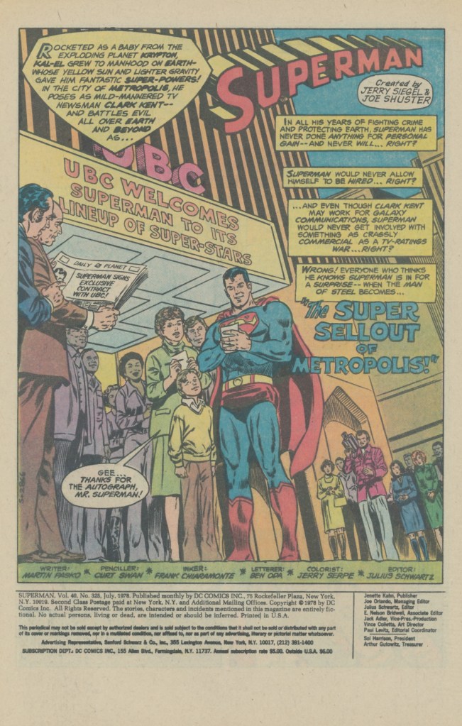 This was the third storyline to feature the villain Blackrock, a television-empowered character connected to the UBC Broadcasting Company. I wasn’t worldly enough in 1978 to understand the reference–that Blackrock was named after NBC’s famous 30 Rockefeller Plaza office building, and that he had been created at the behest of a fictionalized version of Fred Silverman. So to me, he was simply a character with a shtick (and an ever-changing identity–a different individual was inside the Blackrock costume each time he battled the Man of Steel. UBC had created Blackrock as a counterpart to Superman, whom they felt was clearly being financed by Morgan Edge’s WGBS given how often stories and footage of the Man of Steel’s exploits wound up in the hands of GBS reporters such as Clark Kent and Lois Lane. But as this story opens, the situation is far different.