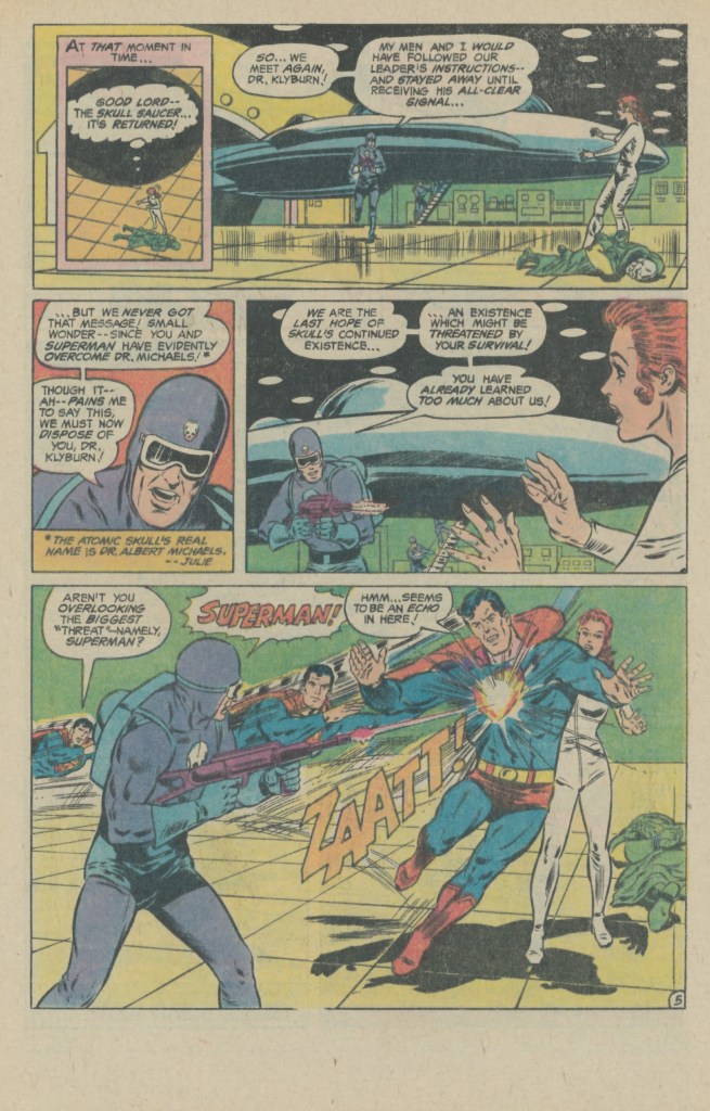 But before he can get to the bottom of his own problems, he first needs to complete his rescue of Dr. Klyburn and polish off the remainder of the Skull forces. which he does for the most part–the Atomic Skull himself eludes capture when Superman suddenly stiffens and is compelled to carve some graffiti into the ground excoriating WGBS for its ethical practices. This continues to happen repeatedly–Superman blacks out, creates some anti-WGBS message, then wakes up a little while later none the wiser. The Last Son of Krypton is increasingly worried about his erratic behavior–but not so worried that investigating it can’t wait until after Clark Kent’s evening broadcast. Which seems like a spurious decision, but there you go.
