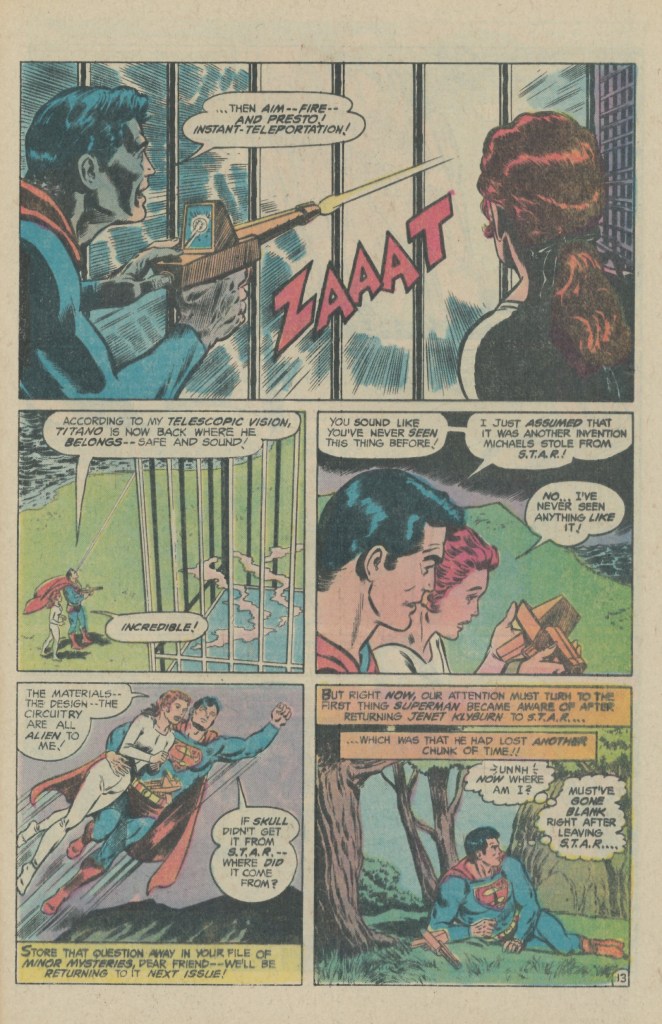 At the beginning of this issue, the people of Metropolis are stunned by the announcement that Superman has signed a contract with their network. Particularly confused by this turn of events are Superman’s friends such as Lois Lane, who tells rival Lana Lang that it was against Superman’s principles to equate himself with any particular network, or to profit from his endeavors. But the Man of Steel flies off before Lois can speak with him–and from there, we setter into an extended flashback, picking up where the prior story left off. There, Superman had just undone the Atomic Skull’s trap of poisoning the atmosphere with Kryptonite particles, thus eliminating the Metropolis Marvel’s powers–but as he raced back to pick up Dr. Jenet Klyburn and dismantle the SKULL base the Atomic Skull had been operating under, Superman realizes that he’s been having blackouts–he’s got minutes of time unaccounted for.