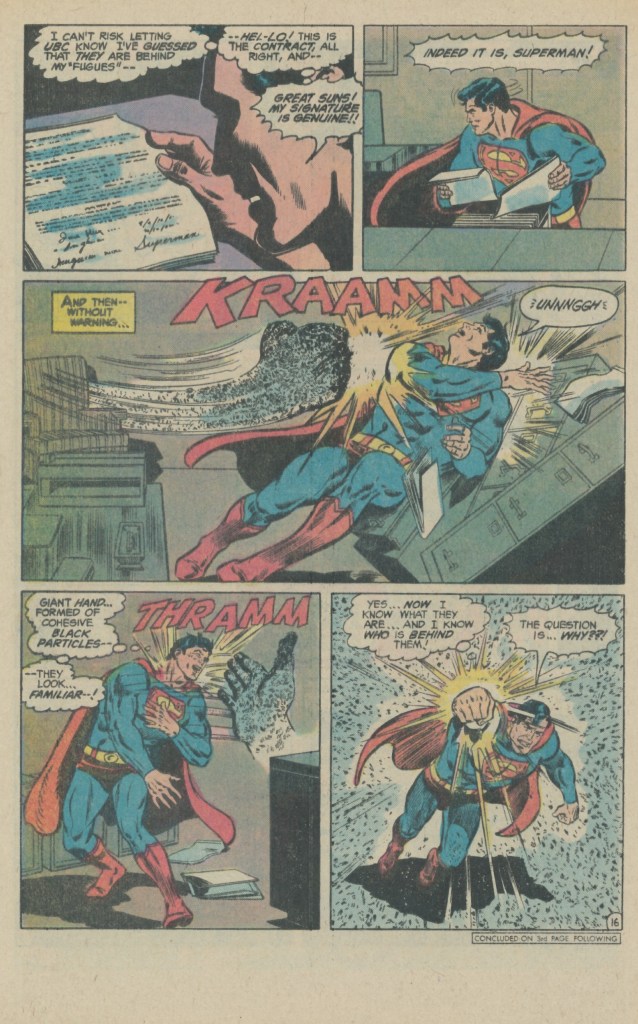 One of the key stories in the broadcast concerns Superman’s anti-WGBS graffiti spree, the details of which allow Clark to fill in some of the gaps in his memory. But not all of them. And he’s as shocked as anybody when Jimmy Olsen races into the newsroom declaring that has just heard that Superman has signed an exclusive contract with UBC. Clark thinks this may be the break he needed, and so that evening he makes his way into the UBC headquarters in full-on Superman stealth mode to locate the contract he supposedly signed. And his signature there is genuine–but before he can do anything with that knowledge, he’s jumped by the disembodied particle form of Blackrock.