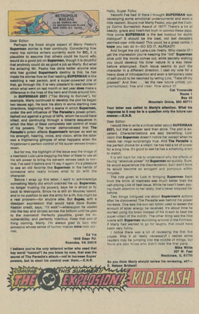 Once again, my weekly sojourn to my local 7-11 on Thursday resulted in a small haul of new comic book issues. Among those books I purchased this week was the latest outing of SUPERMAN, a title that I had been following with regularity for a year or two. Unbeknownst to me, this would be the beginning of writer Marty Pasko’s swan song on the series. I really enjoyed Pasko’s approach to the character–he was something of a stand-out for me at the age of 11, and the book wouldn’t be quite so appealing in my eyes once he’d departed its pages.