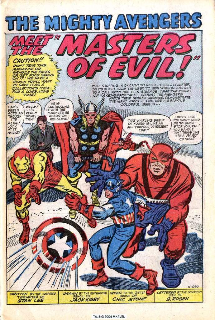 Realizing that in order to eliminate Captain America he’s going to be coming up against the Captain’s teammates in the Avengers as well, Zemo goes on an off-camera recruiting spree, bringing on board a trio of villains each of whom had escaped being captured at the end of their earlier encounters with the individual Avengers heroes. This crew is christened the Masters of Evil. And so it is that the Black Knight, the Melter and the Radioactive Man stage attacks on New York City. They deploy tanks filled with Adhesive X in order to bring the city to a halt. Captain America and Giant-Man wind up stuck to a bit of pavement. But in another random bit of continuity, the Wasp calls over to the prison where the Human Torch’s foe Paste Pot Pete is being detained, and offers him amnesty in exchange for his help getting Cap and Giant-Man unstuck. Here, Kirby makes a bit of an error and draws not Paste Pot Pete but rather his teammate from the last story he had been in, the Wizard. Lee, whether he realized the mistake or not, simply scripts this sequence as though this is Pete, so it doesn’t wind up changing the trajectory of the story at all.