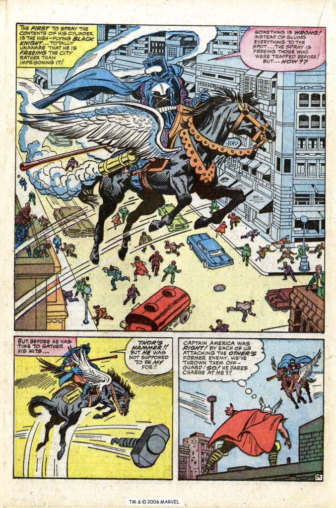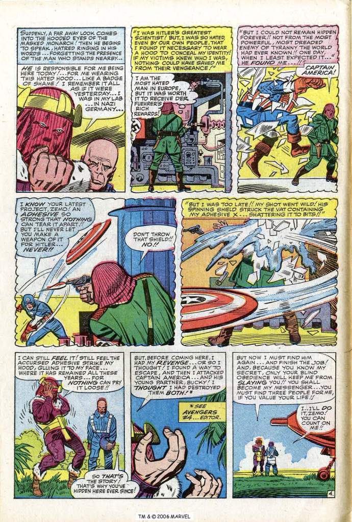 With the help of Rick Jones and his Teen Brigade, the Avengers are able to swap the Masters of Evil’s tanks of Adhesive X with Paste Pot Pete’s solvent, causing the trio of villains to undo all of the work that they had accomplished earlier as they continue to buzz the city. But then the fight is on, and Kirby rather cannily has the Avengers switch targets as they engage. Thus, Thor contends with the Black Knight, Iron Man and Giant-Man make a meal of the Radioactive Man (wrapping him up head to toe in a lead-based tape-spool Tony Stark provided) and then Iron man is also able to take down the Melter by causing him to disintegrate a fire hydrant that knocks him on his backside with a spray of water. Captain America, meanwhile, has headed to the heart of the conflict, to confront his old foe Zemo and to get some payback for Bucky’s death.
