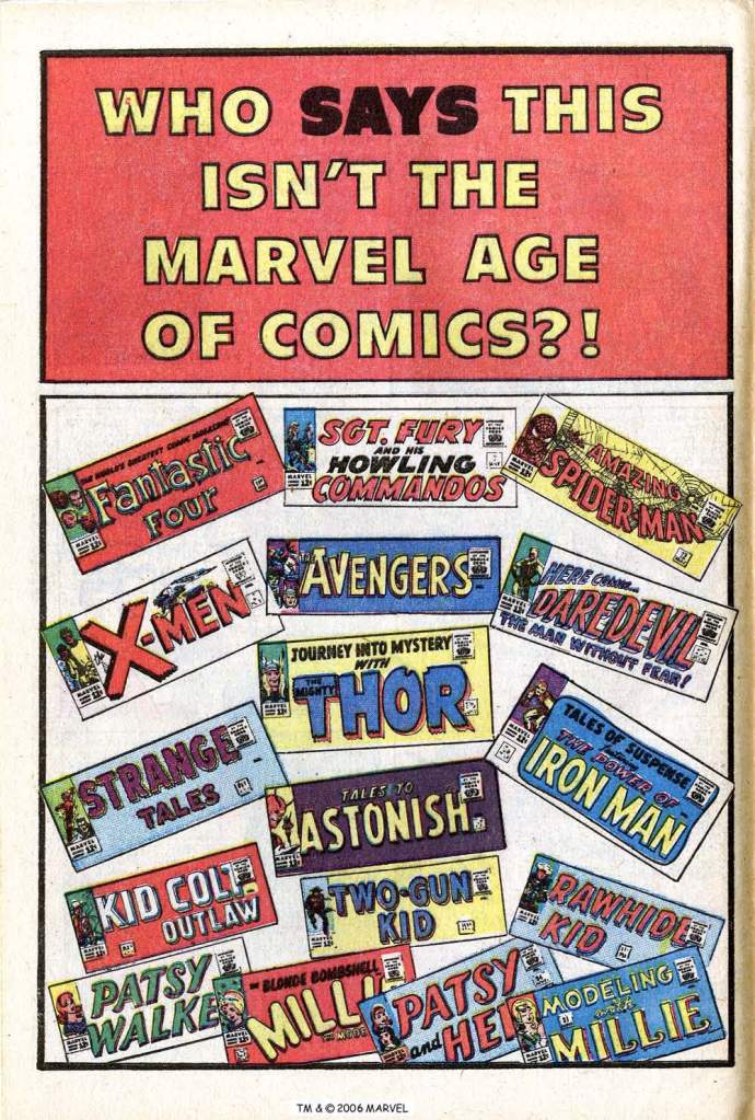 Speaking of crafting a cohesive line, we get this full page ad around this point in the book, one touting the logos of all of the books Marvel was publishing at this point (including the westerns and the girl romance titles.) This has the feel of a last minute bit of filler, the replacement for a cover that wasn’t completed in time or some such thing. But it was another way that Lee was trying to create brand loyalty in his young readership.