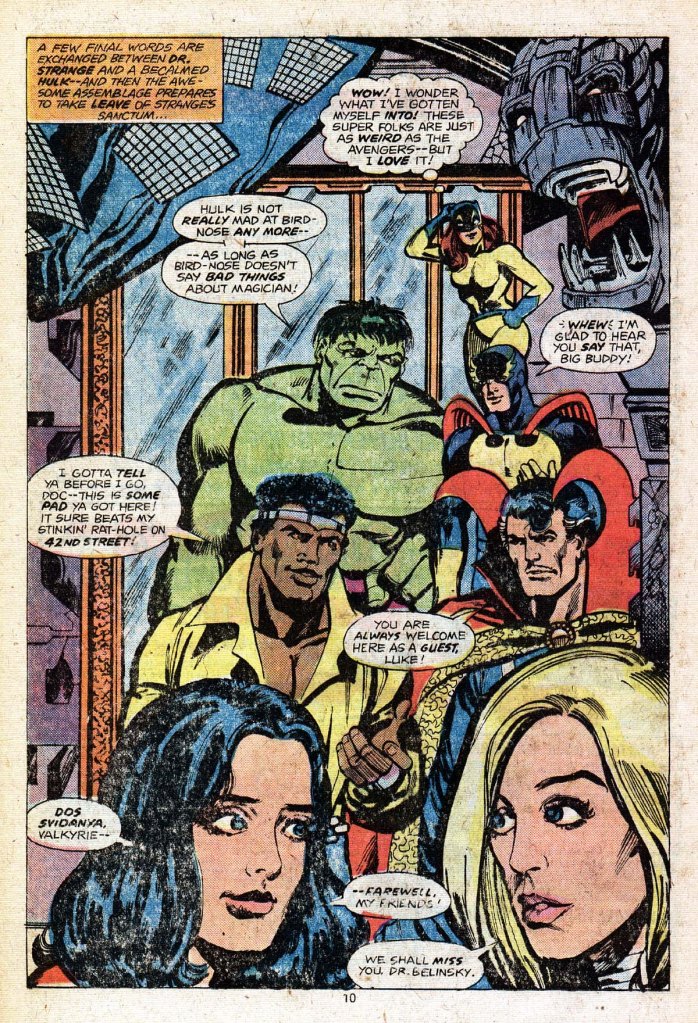 As such, this was a bit of a transition issue, with the composition of the group immediately thrown into flux by Dr. Strange’s announcement that he needs to leave the group to rededicate himself to his mystic studies. Also on the way out are Luke Cage, who isn’t earning a paycheck hanging around with these weirdos, and the female Red Guardian, who had been something of a hanger on the past couple of months. Additionally, Doc’s departure means that the Defenders need a new place to hang out while waiting for trouble to turn up, and so Nighthawk offers up his Richmond Riding Academy. So those members (as much as a non-team could have “members”0 who were sticking around decided to head out to Nighthawk’s place and reconvene there.