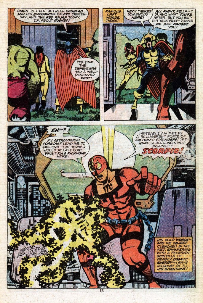 In any case, the Defenders make it out to Nighthawk’s digs and prepare themselves for an evening of relaxation–only to be shockingly confronted by a super-villain out of nowhere. This is Scorpio, a character first conceived by Jim Steranko in the pages of NICK FURY, AGENT OF S.H.I.E.L.D. He’s looking for Kyle Richmond for some reason, and doesn’t realize that Kyle is Nighthawk. But that doesn’t stop a big ol’ fight from breaking out, with Scorpio using the Zodiac Key, a powerful dimensional weapon, to even the odds.