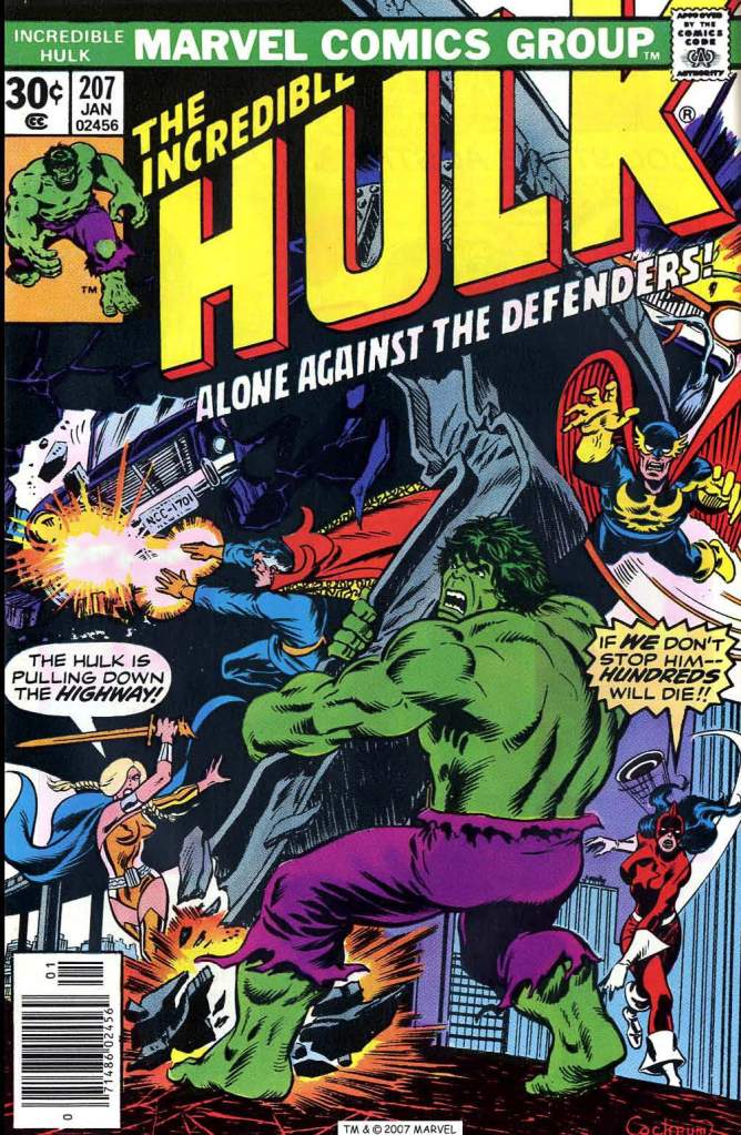I was quite happy to find this issue of INCREDIBLE HULK, in one of those plastic-wrapped bundles of coverless comics my local drug store had been selling–in fact, it may even have been the reason why I bought the bundle in question. Because I already owned issues #206 and #208, and #206 had ended with a terrific cliffhanger: driven into a rampage by his grief over the death of his girlfriend Jarella, the Hulk was paused in his tracks by the arrival of his friends, the Defenders. And this portended a massive fight to come–one that was long resolved by the opening to issue #208. So I was hungry to see what had gone down. Additionally, there was always something intangibly satisfying about filling in a hole in my collection, even a single-issue hole such as this one. Buying these slightly-older Marvel titles at the time felt like filling in the pieces on some elaborate jigsaw puzzle that had been going on since 1961. So every additional piece added just a little bit more to the overall picture and my sense of it.