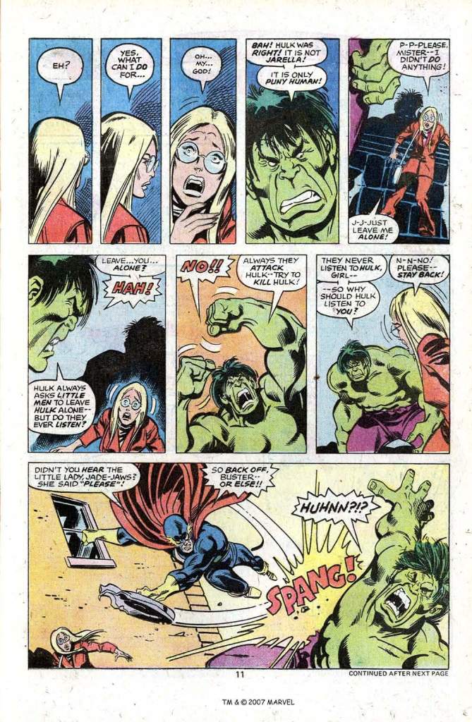 Given his childlike nature, the Hulk had been hoping that his friend Doctor Strange might be able to cure Jarella of being dead–which sounds silly, but this notion is put over with earnestness. But now that Strange and the Defenders have seemingly spat in his face, the Hulk is a bomb looking for a place to explode. Events hit a critical point when the man-child sees a blond woman on the street, and mistakes her for a second for Jarella. When it turns out she isn’t his stricken love, the Hulk goes berserk–and it’s at this moment that the Defenders turn up again. Timing is not one of their super-attributes, it seems. Doctor Strange tries to de-escalate the situation with the Hulk, but the green behemoth has had it.