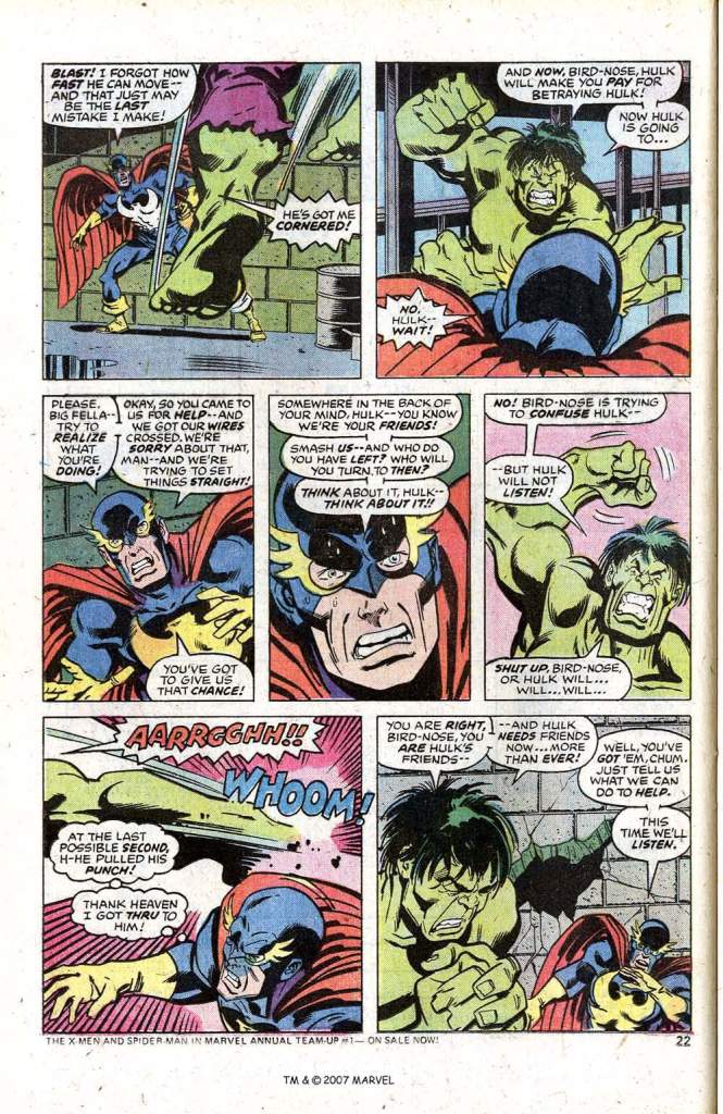 Unfortunately, the Hulk’s attach damages the supports to an elevated highway, and Strange is forced to employ the Ruby Rays of Raggador to support the structure until a more permanent fix can be cobbled together. But it’s enough to take him out of the fight. And as capable as they may be, Valkyrie, the Red Guardian and Nighthawk are no match for the Hulk, and incapable of even materially slowing him down. He goes through the Defenders like they were wet paper, and it’s only a last-second appeal from Nighthawk that prevents the Hulk from taking the bird-nosed crusader’s head off his shoulders. And with that, the Hulk’s anger has run its course, and he accepts that Nighthawk and the others are truly his friends, and that they want to help him.