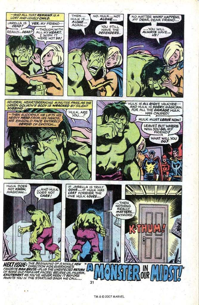 And this is really the heart of the story in question–and it works wonderfully as depicted by Wein and Buscema. The Hulk works his way through the stages of grief as the Defenders watch, offering what emotional support they can. You truly get a feeling for the Hulk as a wayward child in this sequence–he’s not lamenting the loss of a friend or a lover per se so much as something akin to a parent. Ultimately, the issue ends with a now-calmed Hulk quietly taking his leave, uncertain once more of his place in the world and with none to stand beside him. It’s a pretty good example of the strengths that Wein brought to his interpretation of the character.