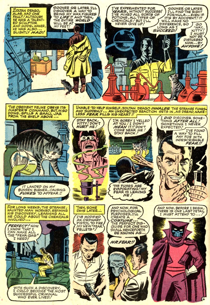 Upon taking over DAREDEVIL with issue #5, Wood immediately began to recast it in his own image. He began to refine Bill Everett and Jack Kirby’s costume design for the sightless crusader–eventually discarding it entirely in favor of a much more streamlined and dramatic all-red uniform that is till employed today. The story structure of the series got better and more polished, and the artwork was much lovelier to look at. In the first four issues, Lee seemed not quite sure what sorts of threats Daredevil ought to be taking on. But Wood, as Ditko did on AMAZING SPIDER-MAN before him, defined what it meant to be a Daredevil antagonist. For this issue, he invented Mister Fear, who has become a mainstay in the Man Without Fear’s rogues gallery. Mister Fear’s gimmick is that he came up with a chemical that caused an immediate fear-response in anybody exposed to it, and which he decided to use to go from Wax Museum manager to costumed super-villain. He also possessed the memorable civilian name of Zoltan Drago–anybody with a monicker like that one is destined for eventual villainy. To aid him in his foray into the underworld, Mister Fear recruited two underlings from earlier Marvel stories: the Ox, from Ditko’s Enforcers, and the Eel, who had appeared in a pair of Human Torch tales.