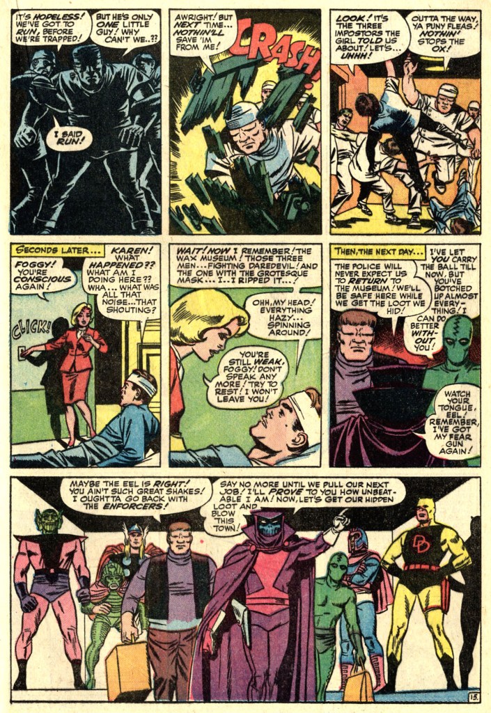The story opens with Daredevil stumbling upon a film being shot. Except it isn’t really a film–it’s all a cover for the Ox and the Eel to take off a robbery. Once the sightless crusader dopes things out, he swings to the attack and knocks the two villains around. But e’s cowed by the appearance of their leader, Mister Fear, whose Fear Gun makes even the renowned Man Without Fear quiver. As Matt Murdock, Daredevil questions whether he’s losing his nerve. Elsewhere, his heist foiled by Daredevil, Mister Fear decides to lure his foe into a trap by advertising a new Daredevil exhibit in Zoltan Drago’s Wax Emporium. Fear intuits that Daredevil will turn up to see the exhibit, and then he and his Fellowship of Fear can jump the yellow-clad super hero. And Drago isn’t wrong, despite the fact that Matt is blind. He and his officemates Foggy Nelson and Karen Page do come out to see the new Daredevil figure. While there, Foggy catches a glimpse of the Ox and decides to come back later and investigate, the idiot. And Matt catches a whiff of Fear’s terrifying chemical compound and likewise decides to come back later in costume.