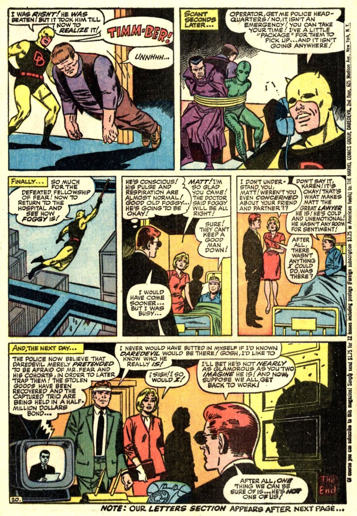 By standing in front of a handy air conditioning fan, Daredevil is able to blow Mister Fear’s petrifying fumes back at him, putting the Fellowship of Fear into disarray. Like Ditko, Wood breaks down his fight choreography into smaller panels, sometimes as many as nine to a page. But the images are elegant, and while they don’t possess quite the power of Kirby, they sit comfortably next to Ditko’s. Anyway, Daredevil whips teh Fellowship of Fear, Foggy is discharged, and all’s well that ends well.